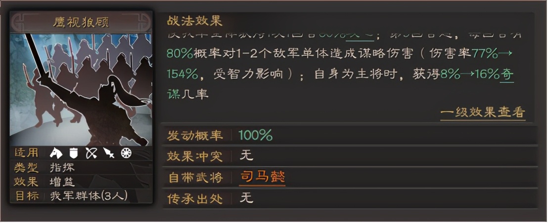 效果:巾帼女衣专属,司马懿装备时提高30%奇谋伤害。